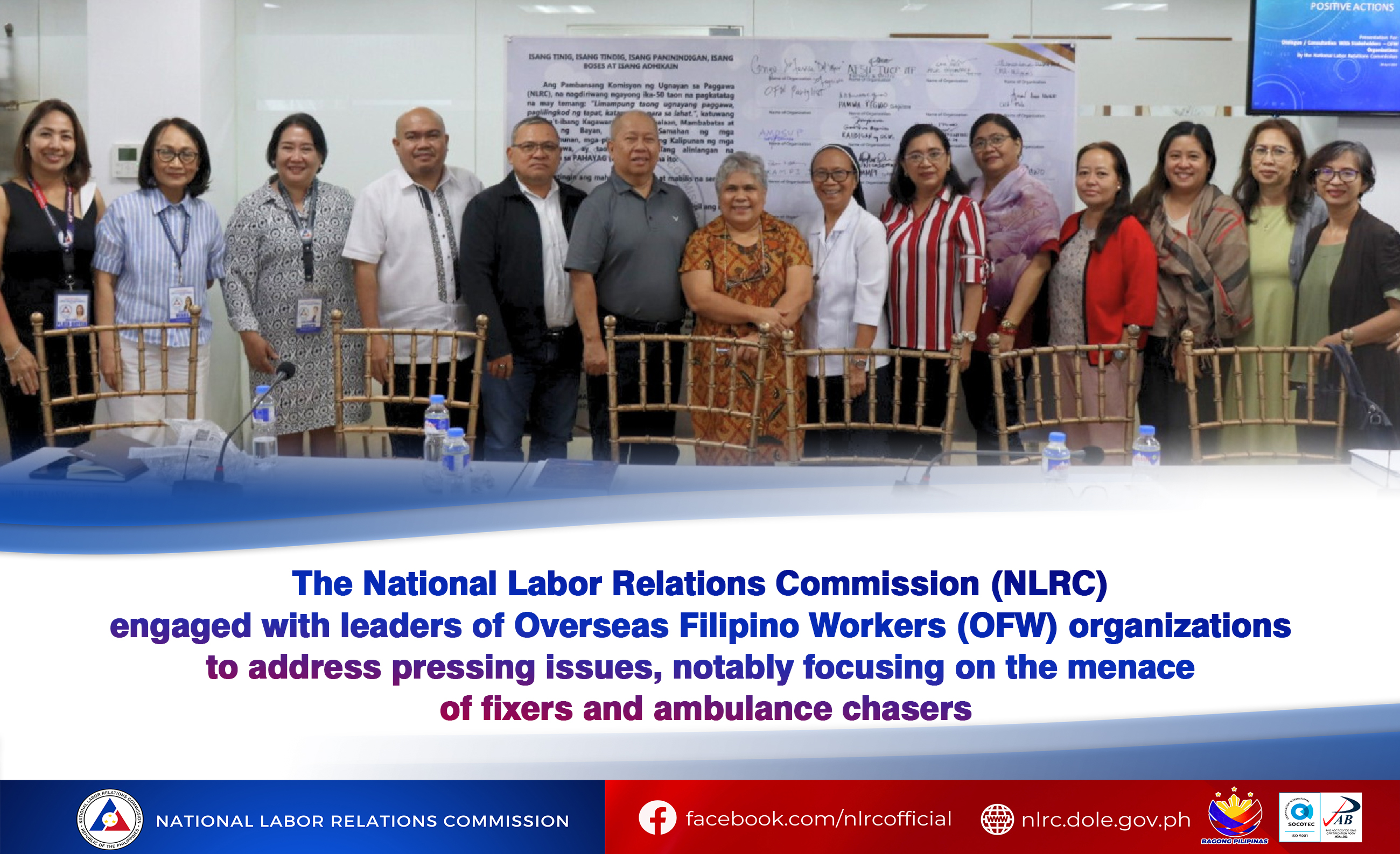 The National Labor Relations Commission (NLRC) engaged with leaders of Overseas Filipino Workers (OFW) organizations to address pressing issues, notably focusing on the menace of fixers and ambulance chasers