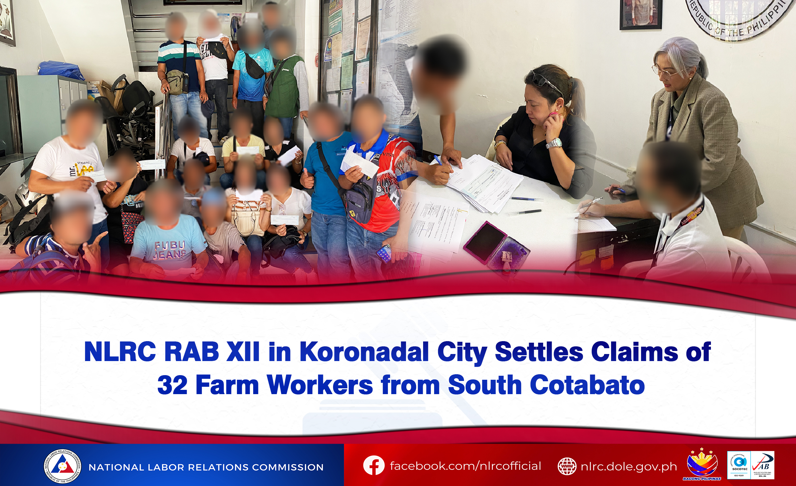 Koronadal City – In a significant development for labor rights in the agricultural sector, the National Labor Relations Commission Regional Arbitration Branch XII (NLRC RAB XII) has successfully settled the claims of 32 farm workers from the towns of Surallah, T'boli, Banga, and Polomolok in the province of South Cotabato against a prominent agricultural plantation company operating in the region.