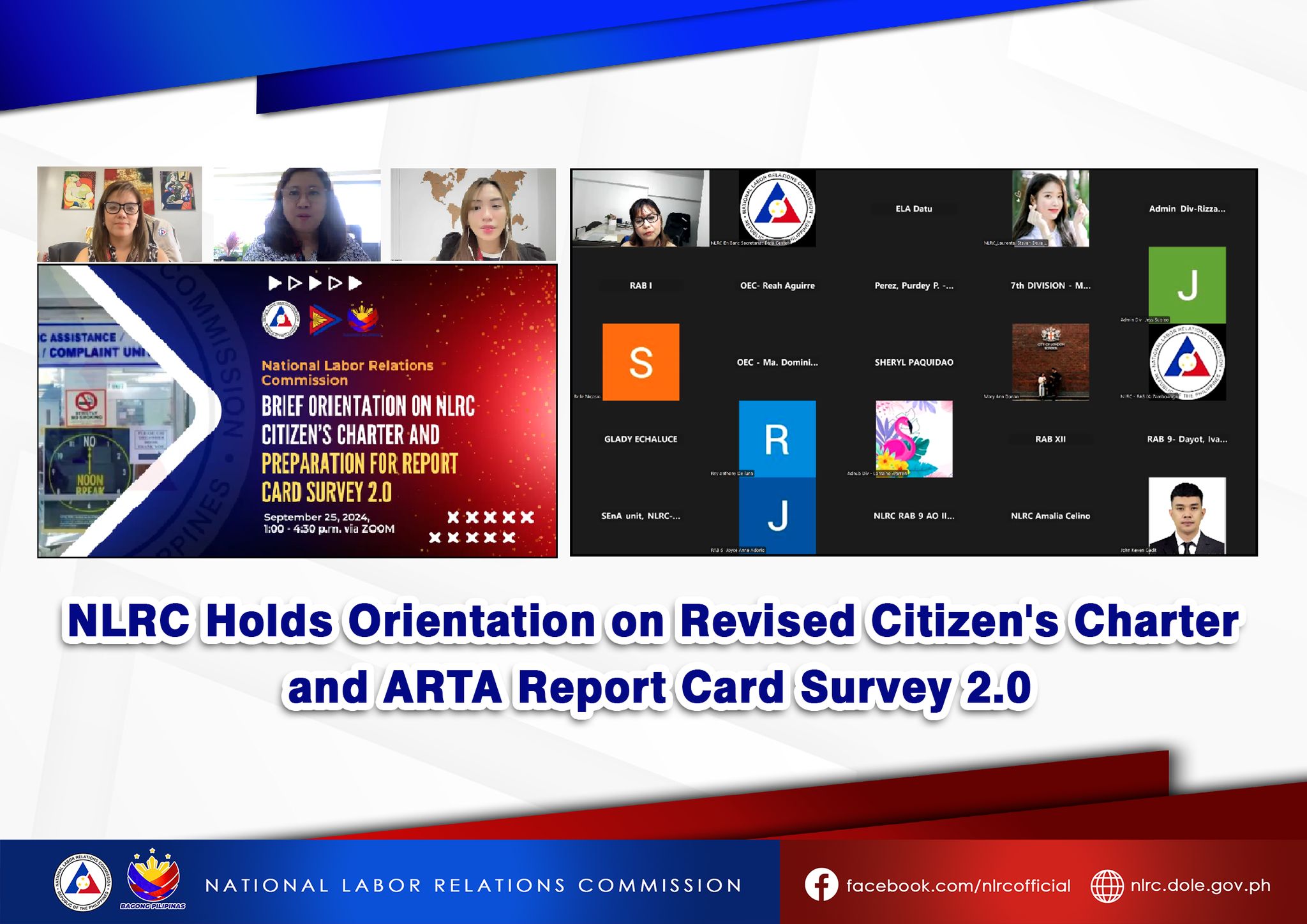 The National Labor Relations Commission (NLRC) successfully conducted an orientation on the revised NLRC Citizen's Charter and the upcoming ARTA (Anti-Red Tape Authority) Report Card Survey 2.0. Held via Zoom on September 25, 2024, the orientation was attended by officials and employees of the Commission.