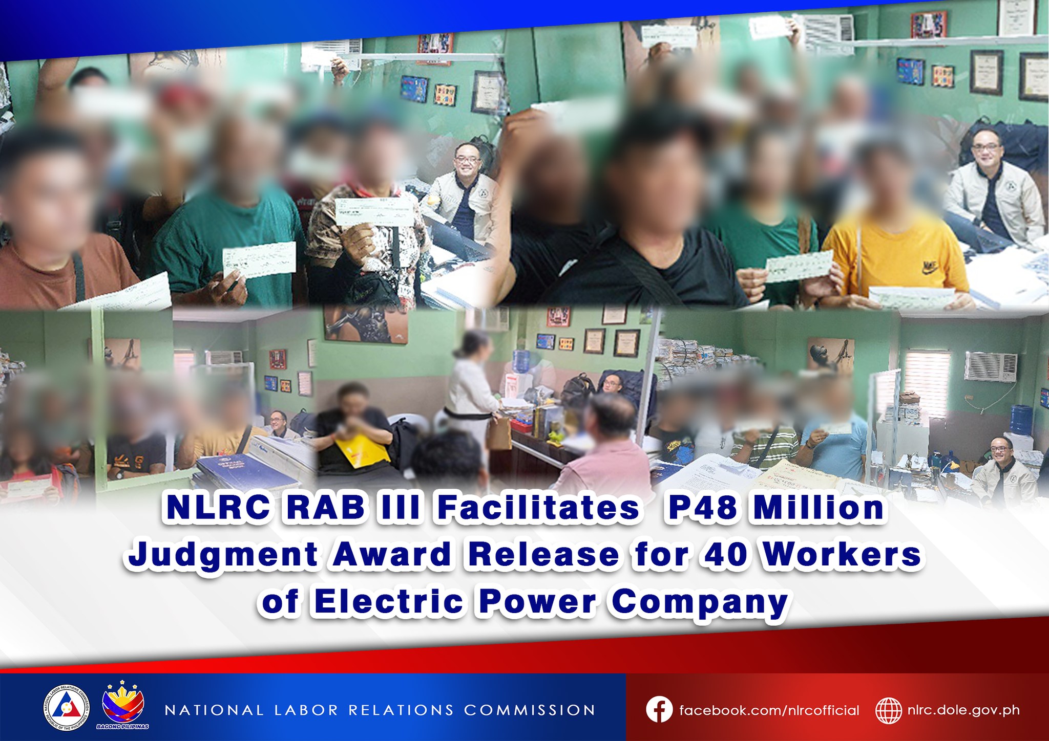 NLRC RAB Ill Facilltates P48 Million Judgment Award Release for 40 Workers of EIectric Power Company