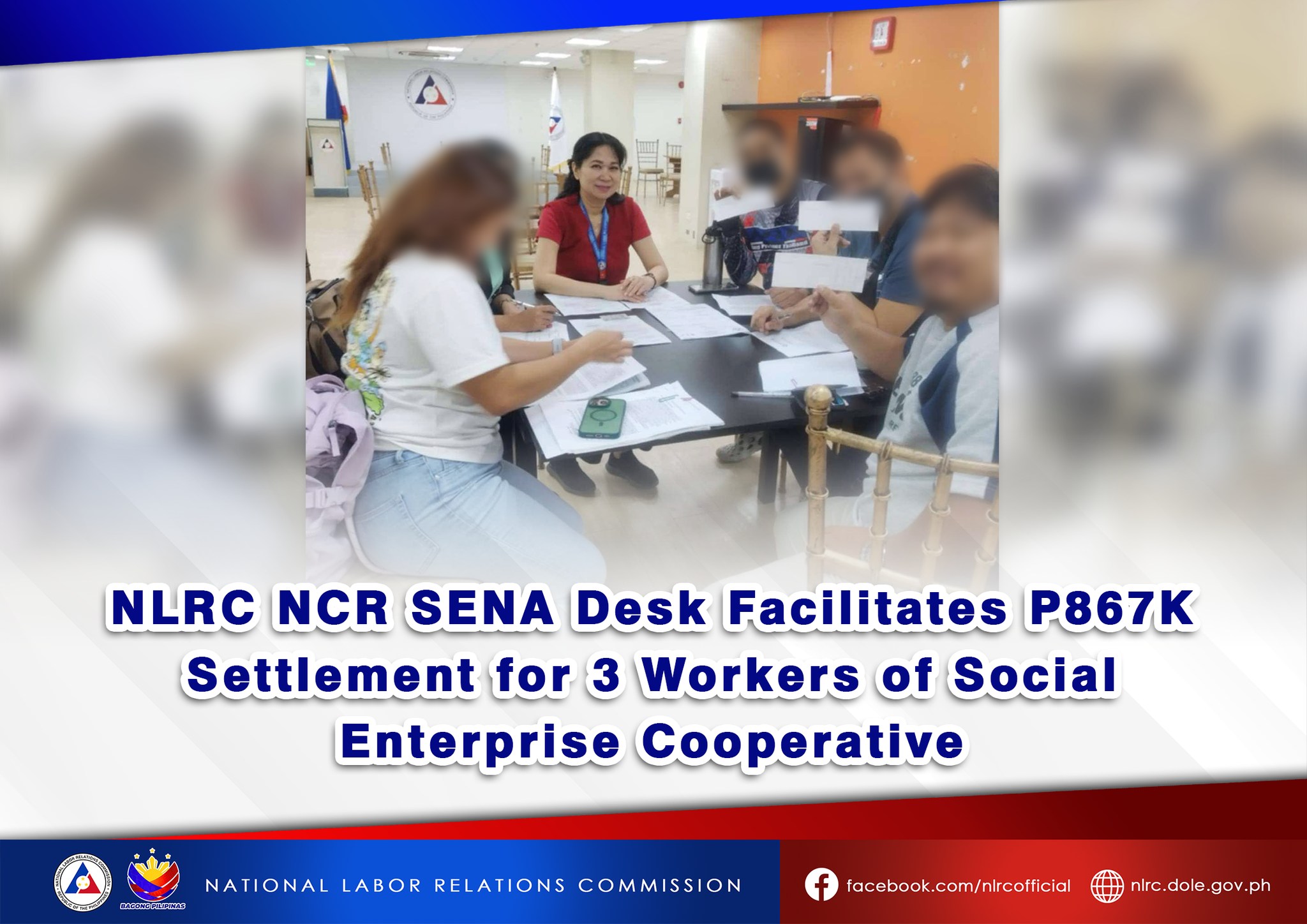Quezon City – The National Labor Relations Commission (NLRC) National Capital Region (NCR), through its Single Entry Approach (SENA) Desk, successfully facilitated a settlement totaling ?867,511.62 for 3 workers employed by a social enterprise cooperative engaged in service contracting and business process outsourcing.