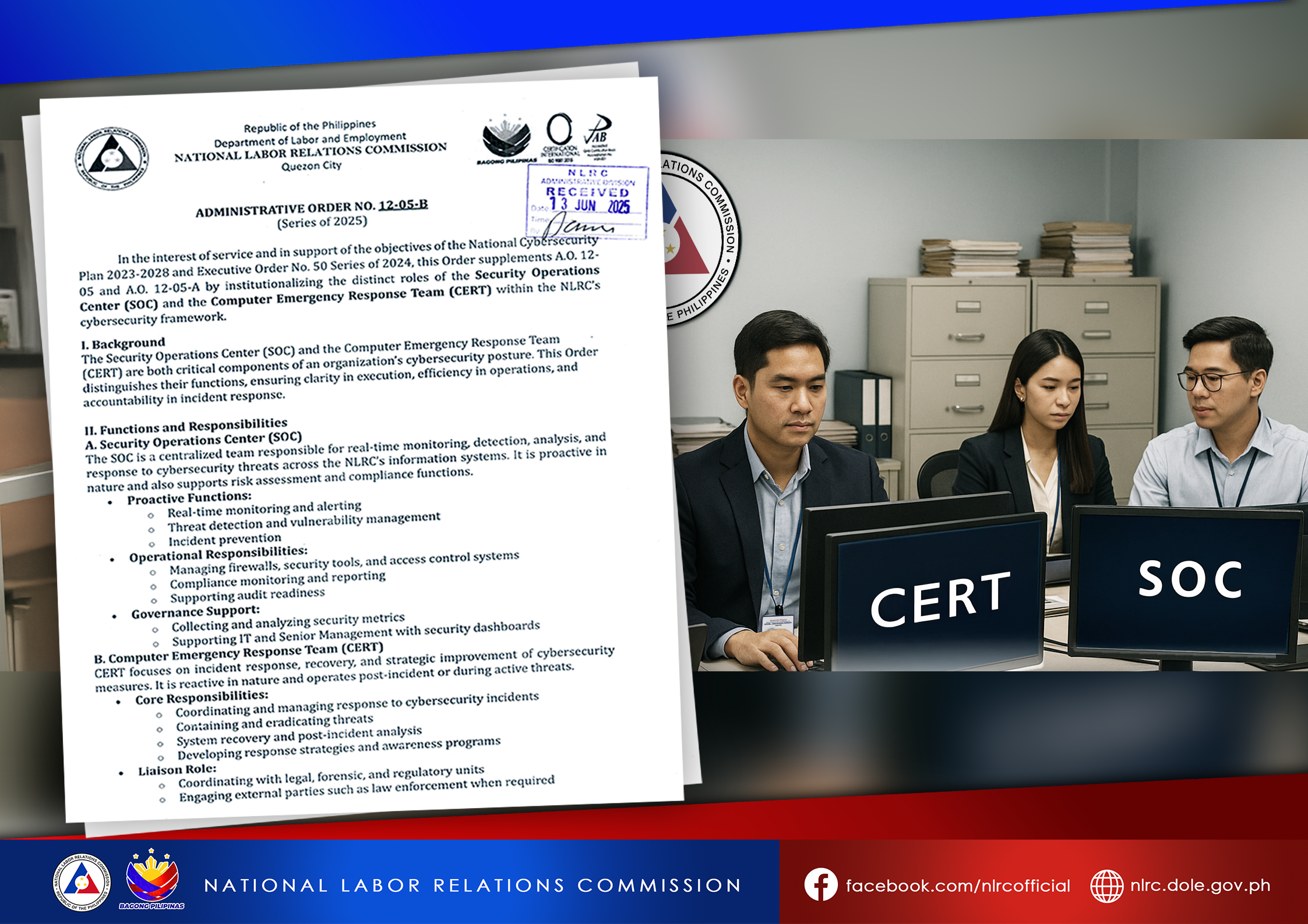 The Order clearly defines and institutionalizes the distinct roles of two key units within the NLRC’s cybersecurity framework—the Security Operations Center (SOC) and the Computer Emergency Response Team (CERT). While both are crucial to protecting the Commission’s information systems, the Order outlines their separate mandates to enhance operational clarity, efficiency, and accountability.