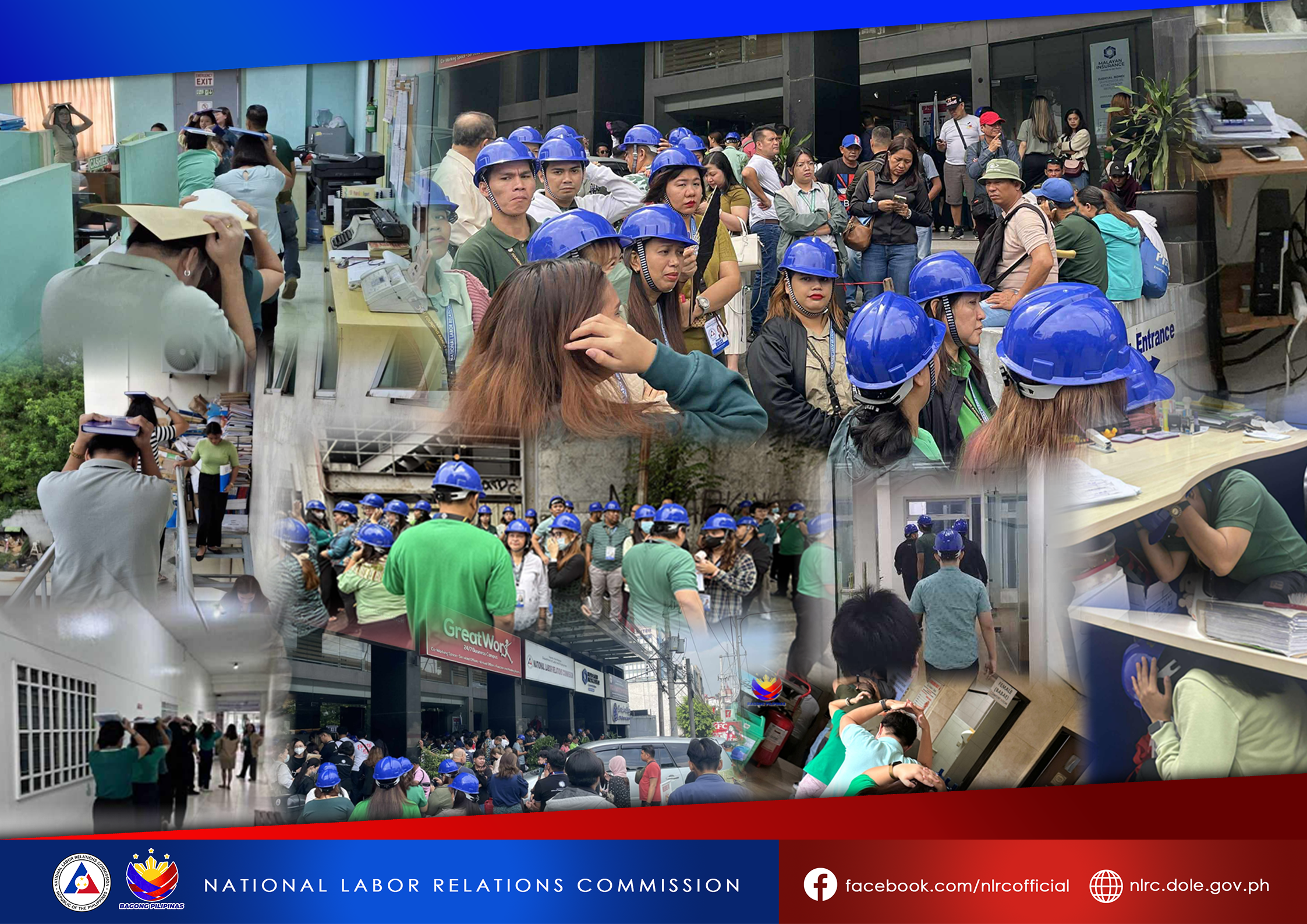 Quezon City — In line with the government's continuing efforts to promote disaster preparedness and resilience, the National Labor Relations Commission (NLRC) actively participated in the Nationwide Simultaneous Earthquake Drill (NSED) conducted on June 19, 2025. This activity is pursuant to Memorandum No. 27, s. 2025 issued by the National Disaster Risk Reduction and Management Council (NDRRMC).