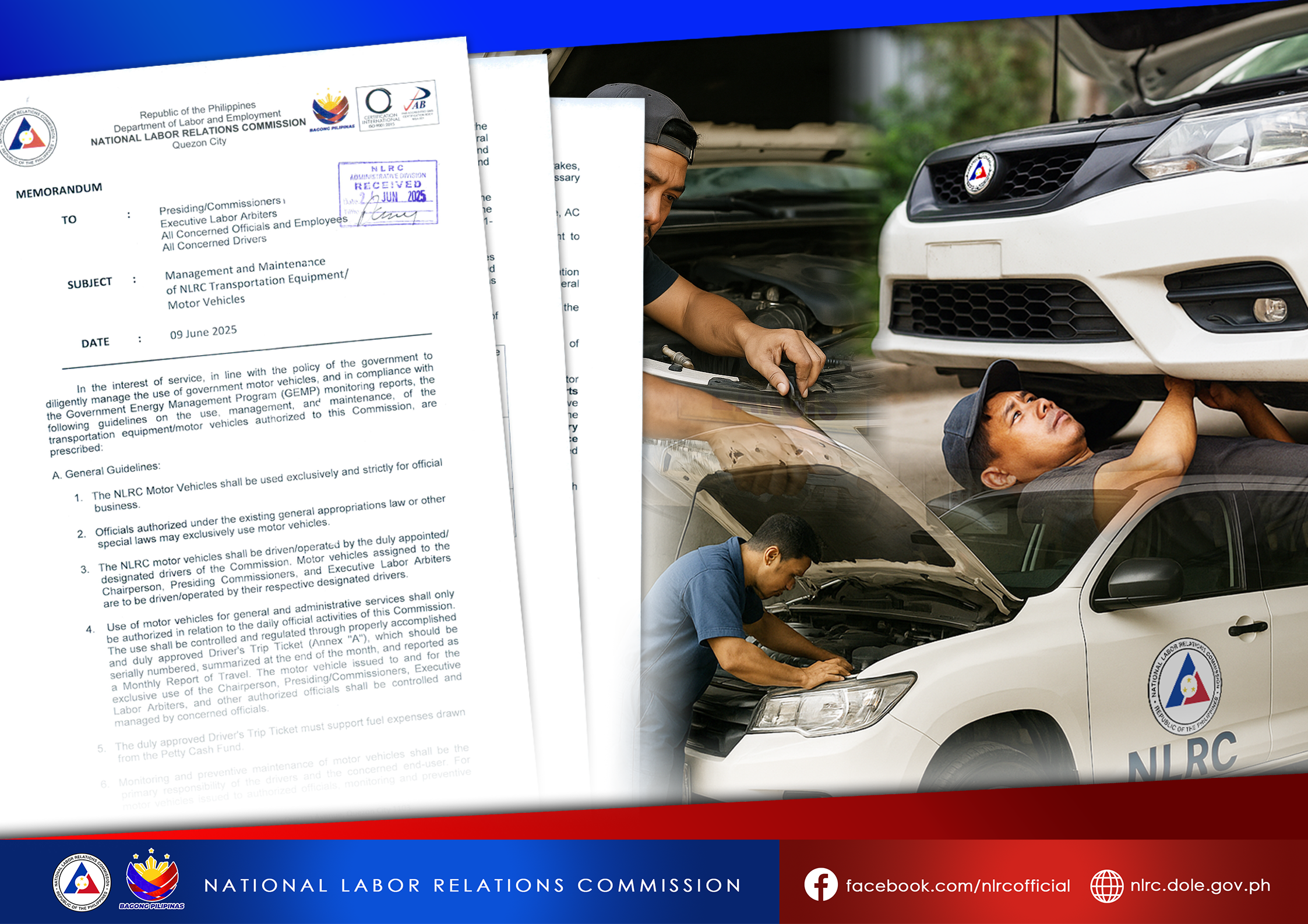 Quezon City – In line with the government’s directive to ensure the prudent use of public resources, the National Labor Relations Commission (NLRC) has issued comprehensive guidelines on the management and maintenance of its transport equipment and services. The new issuance is anchored on the Commission’s commitment to the diligent use of government motor vehicles and in compliance with the Government Energy Management Program (GEMP) monitoring requirements.